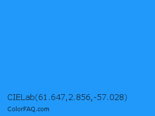 CIELab 61.647,2.856,-57.028 Color is a normal blue color and the nearest color is Dodger Blue #1e90ff. Hex code #2099fa and RGB value is rgb(32,153,250). In RGB color space, this color is composed of 13% red, 60% green, 98% blue, In CMYK color space, this color is composed of 87% cyan, 39% magenta, 0% yellow , 2% black , In HSL color space, this color has a hue angle of 207° , 96% saturation and 55% lightness.