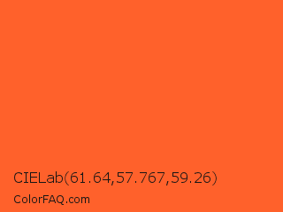 CIELab 61.64,57.767,59.26 Color is a normal color and the nearest color is Outrageous Orange Crayola #ff6037. Hex code #ff612b and RGB value is rgb(255,97,43). In RGB color space, this color is composed of 100% red, 38% green, 17% blue, In CMYK color space, this color is composed of 0% cyan, 62% magenta, 83% yellow , 0% black , In HSL color space, this color has a hue angle of 15° , 100% saturation and 58% lightness.