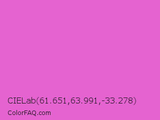 CIELab 61.651,63.991,-33.278 Color is a light magenta color and the nearest color is Orchid #da70d6. Hex code #e562d1 and RGB value is rgb(229,98,209). In RGB color space, this color is composed of 90% red, 38% green, 82% blue, In CMYK color space, this color is composed of 0% cyan, 57% magenta, 9% yellow , 10% black , In HSL color space, this color has a hue angle of 309° , 72% saturation and 64% lightness.