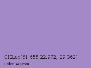 CIELab 61.655,22.972,-29.362 Color is a light violet color and the nearest color is East Side #ac91ce. Hex code #a489c9 and RGB value is rgb(164,137,201). In RGB color space, this color is composed of 64% red, 54% green, 79% blue, In CMYK color space, this color is composed of 18% cyan, 32% magenta, 0% yellow , 21% black , In HSL color space, this color has a hue angle of 265° , 37% saturation and 66% lightness.