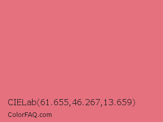 CIELab 61.655,46.267,13.659 Color is a light red color and the nearest color is Candy Pink #e4717a. Hex code #e5717f and RGB value is rgb(229,113,127). In RGB color space, this color is composed of 90% red, 44% green, 50% blue, In CMYK color space, this color is composed of 0% cyan, 51% magenta, 45% yellow , 10% black , In HSL color space, this color has a hue angle of 353° , 69% saturation and 67% lightness.