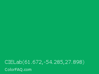 CIELab 61.672,-54.285,27.898 Color is a normal green color and the nearest color is GO Green #00ab66. Hex code #05ab61 and RGB value is rgb(5,171,97). In RGB color space, this color is composed of 2% red, 67% green, 38% blue, In CMYK color space, this color is composed of 97% cyan, 0% magenta, 43% yellow , 33% black , In HSL color space, this color has a hue angle of 153° , 94% saturation and 35% lightness.