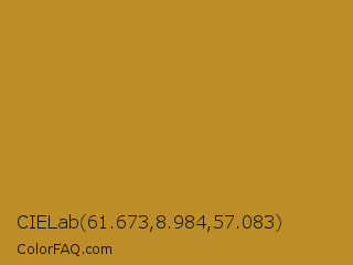 CIELab 61.673,8.984,57.083 Color is a normal orange color and the nearest color is Marigold #b98d28. Hex code #bd8d28 and RGB value is rgb(189,141,40). In RGB color space, this color is composed of 74% red, 55% green, 16% blue, In CMYK color space, this color is composed of 0% cyan, 25% magenta, 79% yellow , 26% black , In HSL color space, this color has a hue angle of 41° , 65% saturation and 45% lightness.