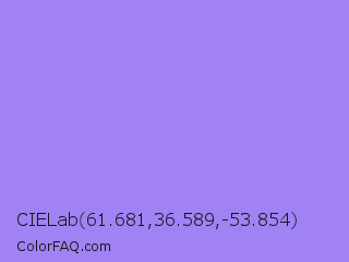 CIELab 61.681,36.589,-53.854 Color is a light indigo color and the nearest color is Dull Lavender #a899e6. Hex code #a082f5 and RGB value is rgb(160,130,245). In RGB color space, this color is composed of 63% red, 51% green, 96% blue, In CMYK color space, this color is composed of 35% cyan, 47% magenta, 0% yellow , 4% black , In HSL color space, this color has a hue angle of 256° , 85% saturation and 74% lightness.
