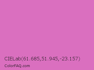 CIELab 61.685,51.945,-23.157 Color is a light magenta color and the nearest color is Sky Magenta #cf71af. Hex code #da6fbf and RGB value is rgb(218,111,191). In RGB color space, this color is composed of 85% red, 44% green, 75% blue, In CMYK color space, this color is composed of 0% cyan, 49% magenta, 12% yellow , 15% black , In HSL color space, this color has a hue angle of 315° , 59% saturation and 65% lightness.