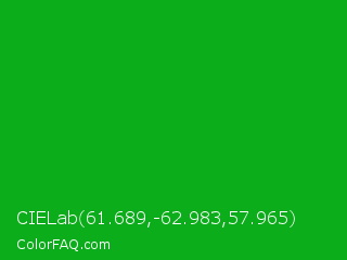 CIELab 61.689,-62.983,57.965 Color is a normal green color and the nearest color is Slimy Green #299617. Hex code #0cad1a and RGB value is rgb(12,173,26). In RGB color space, this color is composed of 5% red, 68% green, 10% blue, In CMYK color space, this color is composed of 93% cyan, 0% magenta, 85% yellow , 32% black , In HSL color space, this color has a hue angle of 125° , 87% saturation and 36% lightness.