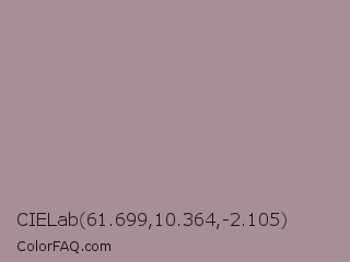 CIELab 61.699,10.364,-2.105 Color is a light rose color and the nearest color is Dusty Gray #a8989b. Hex code #a68f99 and RGB value is rgb(166,143,153). In RGB color space, this color is composed of 65% red, 56% green, 60% blue, In CMYK color space, this color is composed of 0% cyan, 14% magenta, 8% yellow , 35% black , In HSL color space, this color has a hue angle of 334° , 11% saturation and 61% lightness.