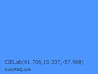 CIELab 61.706,10.337,-57.968 Color is a light blue color and the nearest color is Blueberry #4f86f7. Hex code #4c95fc and RGB value is rgb(76,149,252). In RGB color space, this color is composed of 30% red, 58% green, 99% blue, In CMYK color space, this color is composed of 70% cyan, 41% magenta, 0% yellow , 1% black , In HSL color space, this color has a hue angle of 215° , 97% saturation and 64% lightness.