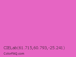 CIELab 61.715,60.793,-25.241 Color is a light magenta color and the nearest color is Orchid #da70d6. Hex code #e665c3 and RGB value is rgb(230,101,195). In RGB color space, this color is composed of 90% red, 40% green, 76% blue, In CMYK color space, this color is composed of 0% cyan, 56% magenta, 15% yellow , 10% black , In HSL color space, this color has a hue angle of 316° , 72% saturation and 65% lightness.