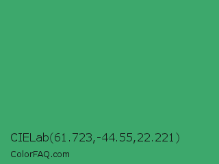 CIELab 61.723,-44.55,22.221 Color is a normal green color and the nearest color is Medium Sea Green #3cb371. Hex code #3da86c and RGB value is rgb(61,168,108). In RGB color space, this color is composed of 24% red, 66% green, 42% blue, In CMYK color space, this color is composed of 64% cyan, 0% magenta, 36% yellow , 34% black , In HSL color space, this color has a hue angle of 146° , 47% saturation and 45% lightness.