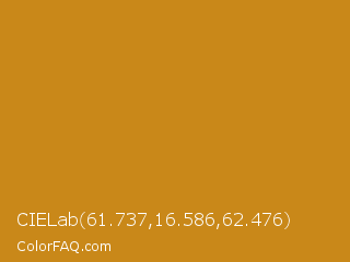 CIELab 61.737,16.586,62.476 Color is a normal orange color and the nearest color is Geebung #d18f1b. Hex code #c98819 and RGB value is rgb(201,136,25). In RGB color space, this color is composed of 79% red, 53% green, 10% blue, In CMYK color space, this color is composed of 0% cyan, 32% magenta, 88% yellow , 21% black , In HSL color space, this color has a hue angle of 38° , 78% saturation and 44% lightness.