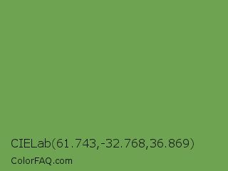 CIELab 61.743,-32.768,36.869 Color is a normal green color and the nearest color is Asparagus Green #7ba05b. Hex code #6ea351 and RGB value is rgb(110,163,81). In RGB color space, this color is composed of 43% red, 64% green, 32% blue, In CMYK color space, this color is composed of 33% cyan, 0% magenta, 50% yellow , 36% black , In HSL color space, this color has a hue angle of 99° , 34% saturation and 48% lightness.