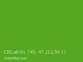 CIELab 61.745,-47.212,56.1 Color is a normal green color and the nearest color is Green RYB #66b032. Hex code #56a823 and RGB value is rgb(86,168,35). In RGB color space, this color is composed of 34% red, 66% green, 14% blue, In CMYK color space, this color is composed of 49% cyan, 0% magenta, 79% yellow , 34% black , In HSL color space, this color has a hue angle of 97° , 66% saturation and 40% lightness.