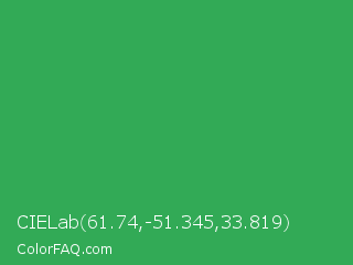 CIELab 61.74,-51.345,33.819 Color is a normal green color and the nearest color is Chateau Green #40a860. Hex code #32aa56 and RGB value is rgb(50,170,86). In RGB color space, this color is composed of 20% red, 67% green, 34% blue, In CMYK color space, this color is composed of 71% cyan, 0% magenta, 49% yellow , 33% black , In HSL color space, this color has a hue angle of 138° , 55% saturation and 43% lightness.