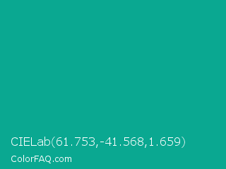 CIELab 61.753,-41.568,1.659 Color is a normal cyan color and the nearest color is Persian Green #00a693. Hex code #0aa891 and RGB value is rgb(10,168,145). In RGB color space, this color is composed of 4% red, 66% green, 57% blue, In CMYK color space, this color is composed of 94% cyan, 0% magenta, 14% yellow , 34% black , In HSL color space, this color has a hue angle of 171° , 89% saturation and 35% lightness.