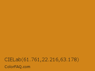 CIELab 61.761,22.216,63.178 Color is a normal orange color and the nearest color is Meteor #d07d12. Hex code #d18418 and RGB value is rgb(209,132,24). In RGB color space, this color is composed of 82% red, 52% green, 9% blue, In CMYK color space, this color is composed of 0% cyan, 37% magenta, 89% yellow , 18% black , In HSL color space, this color has a hue angle of 35° , 79% saturation and 46% lightness.