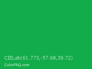 CIELab 61.773,-57.68,39.72 Color is a normal green color and the nearest color is Green Pantone #00ad43. Hex code #13ac4a and RGB value is rgb(19,172,74). In RGB color space, this color is composed of 7% red, 67% green, 29% blue, In CMYK color space, this color is composed of 89% cyan, 0% magenta, 57% yellow , 33% black , In HSL color space, this color has a hue angle of 142° , 80% saturation and 37% lightness.