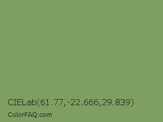 CIELab 61.77,-22.666,29.839 Color is a normal green color and the nearest color is Asparagus Green #7ba05b. Hex code #7f9f5f and RGB value is rgb(127,159,95). In RGB color space, this color is composed of 50% red, 62% green, 37% blue, In CMYK color space, this color is composed of 20% cyan, 0% magenta, 40% yellow , 38% black , In HSL color space, this color has a hue angle of 90° , 25% saturation and 50% lightness.