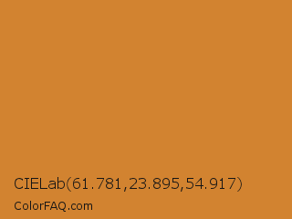 CIELab 61.781,23.895,54.917 Color is a normal orange color and the nearest color is Bronze #cd7f32. Hex code #d28330 and RGB value is rgb(210,131,48). In RGB color space, this color is composed of 82% red, 51% green, 19% blue, In CMYK color space, this color is composed of 0% cyan, 38% magenta, 77% yellow , 18% black , In HSL color space, this color has a hue angle of 31° , 64% saturation and 51% lightness.