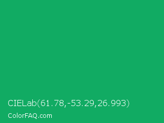 CIELab 61.78,-53.29,26.993 Color is a normal green color and the nearest color is GO Green #00ab66. Hex code #11ab63 and RGB value is rgb(17,171,99). In RGB color space, this color is composed of 7% red, 67% green, 39% blue, In CMYK color space, this color is composed of 90% cyan, 0% magenta, 42% yellow , 33% black , In HSL color space, this color has a hue angle of 152° , 82% saturation and 37% lightness.