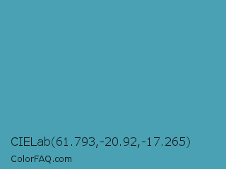 CIELab 61.793,-20.92,-17.265 Color is a normal cyan color and the nearest color is Hippie Blue #589aaf. Hex code #49a1b3 and RGB value is rgb(73,161,179). In RGB color space, this color is composed of 29% red, 63% green, 70% blue, In CMYK color space, this color is composed of 59% cyan, 10% magenta, 0% yellow , 30% black , In HSL color space, this color has a hue angle of 190° , 42% saturation and 49% lightness.