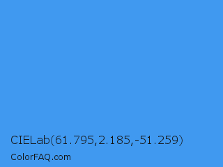 CIELab 61.795,2.185,-51.259 Color is a normal blue color and the nearest color is Brilliant Azure #3399ff. Hex code #4099f0 and RGB value is rgb(64,153,240). In RGB color space, this color is composed of 25% red, 60% green, 94% blue, In CMYK color space, this color is composed of 73% cyan, 36% magenta, 0% yellow , 6% black , In HSL color space, this color has a hue angle of 210° , 85% saturation and 60% lightness.