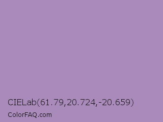 CIELab 61.79,20.724,-20.659 Color is a light purple color and the nearest color is Glossy Grape #ab92b3. Hex code #a98aba and RGB value is rgb(169,138,186). In RGB color space, this color is composed of 66% red, 54% green, 73% blue, In CMYK color space, this color is composed of 9% cyan, 26% magenta, 0% yellow , 27% black , In HSL color space, this color has a hue angle of 279° , 26% saturation and 64% lightness.