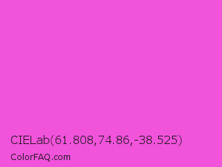 CIELab 61.808,74.86,-38.525 Color is a light magenta color and the nearest color is Purple Pizzazz #fe4eda. Hex code #f253db and RGB value is rgb(242,83,219). In RGB color space, this color is composed of 95% red, 33% green, 86% blue, In CMYK color space, this color is composed of 0% cyan, 66% magenta, 10% yellow , 5% black , In HSL color space, this color has a hue angle of 309° , 86% saturation and 64% lightness.