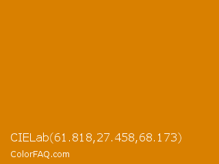 CIELab 61.818,27.458,68.173 Color is a normal orange color and the nearest color is Fulvous #e48400. Hex code #d98000 and RGB value is rgb(217,128,0). In RGB color space, this color is composed of 85% red, 50% green, 0% blue, In CMYK color space, this color is composed of 0% cyan, 41% magenta, 100% yellow , 15% black , In HSL color space, this color has a hue angle of 35° , 100% saturation and 43% lightness.