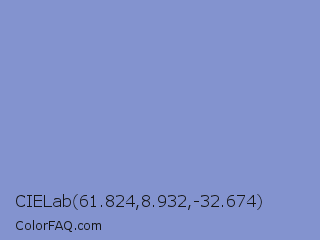 CIELab 61.824,8.932,-32.674 Color is a light blue color and the nearest color is Vista Blue #7c9ed9. Hex code #8393cf and RGB value is rgb(131,147,207). In RGB color space, this color is composed of 51% red, 58% green, 81% blue, In CMYK color space, this color is composed of 37% cyan, 29% magenta, 0% yellow , 19% black , In HSL color space, this color has a hue angle of 227° , 44% saturation and 66% lightness.