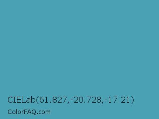 CIELab 61.827,-20.728,-17.21 Color is a normal cyan color and the nearest color is Hippie Blue #589aaf. Hex code #4aa1b3 and RGB value is rgb(74,161,179). In RGB color space, this color is composed of 29% red, 63% green, 70% blue, In CMYK color space, this color is composed of 59% cyan, 10% magenta, 0% yellow , 30% black , In HSL color space, this color has a hue angle of 190° , 42% saturation and 50% lightness.