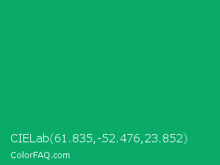 CIELab 61.835,-52.476,23.852 Color is a normal green color and the nearest color is GO Green #00ab66. Hex code #0aab69 and RGB value is rgb(10,171,105). In RGB color space, this color is composed of 4% red, 67% green, 41% blue, In CMYK color space, this color is composed of 94% cyan, 0% magenta, 39% yellow , 33% black , In HSL color space, this color has a hue angle of 155° , 89% saturation and 35% lightness.