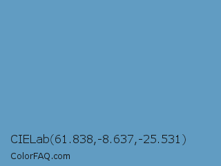 CIELab 61.838,-8.637,-25.531 Color is a normal blue color and the nearest color is Blue Gray #6699cc. Hex code #619cc2 and RGB value is rgb(97,156,194). In RGB color space, this color is composed of 38% red, 61% green, 76% blue, In CMYK color space, this color is composed of 50% cyan, 20% magenta, 0% yellow , 24% black , In HSL color space, this color has a hue angle of 204° , 44% saturation and 57% lightness.