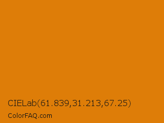 CIELab 61.839,31.213,67.25 Color is a normal orange color and the nearest color is Tahiti Gold #e97c07. Hex code #de7d08 and RGB value is rgb(222,125,8). In RGB color space, this color is composed of 87% red, 49% green, 3% blue, In CMYK color space, this color is composed of 0% cyan, 44% magenta, 96% yellow , 13% black , In HSL color space, this color has a hue angle of 33° , 93% saturation and 45% lightness.