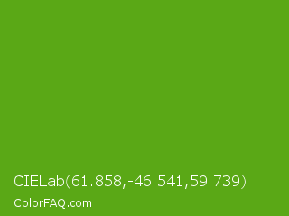 CIELab 61.858,-46.541,59.739 Color is a normal green color and the nearest color is Christi #67a712. Hex code #5aa816 and RGB value is rgb(90,168,22). In RGB color space, this color is composed of 35% red, 66% green, 9% blue, In CMYK color space, this color is composed of 46% cyan, 0% magenta, 87% yellow , 34% black , In HSL color space, this color has a hue angle of 92° , 77% saturation and 37% lightness.