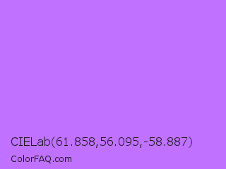 CIELab 61.858,56.095,-58.887 Color is a light purple color and the nearest color is Heliotrope #df73ff. Hex code #c071ff and RGB value is rgb(192,113,255). In RGB color space, this color is composed of 75% red, 44% green, 100% blue, In CMYK color space, this color is composed of 25% cyan, 56% magenta, 0% yellow , 0% black , In HSL color space, this color has a hue angle of 273° , 100% saturation and 72% lightness.