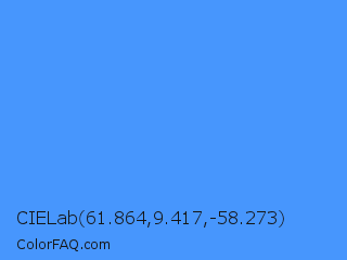 CIELab 61.864,9.417,-58.273 Color is a light blue color and the nearest color is Blueberry #4f86f7. Hex code #4796fd and RGB value is rgb(71,150,253). In RGB color space, this color is composed of 28% red, 59% green, 99% blue, In CMYK color space, this color is composed of 72% cyan, 41% magenta, 0% yellow , 1% black , In HSL color space, this color has a hue angle of 214° , 98% saturation and 64% lightness.