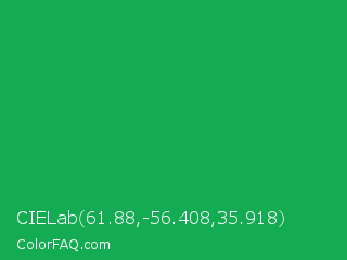 CIELab 61.88,-56.408,35.918 Color is a normal green color and the nearest color is Green Pigment #00a550. Hex code #14ac52 and RGB value is rgb(20,172,82). In RGB color space, this color is composed of 8% red, 67% green, 32% blue, In CMYK color space, this color is composed of 88% cyan, 0% magenta, 52% yellow , 33% black , In HSL color space, this color has a hue angle of 144° , 79% saturation and 38% lightness.