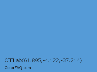 CIELab 61.895,-4.122,-37.214 Color is a normal blue color and the nearest color is Carolina Blue #56a0d3. Hex code #559bd7 and RGB value is rgb(85,155,215). In RGB color space, this color is composed of 33% red, 61% green, 84% blue, In CMYK color space, this color is composed of 60% cyan, 28% magenta, 0% yellow , 16% black , In HSL color space, this color has a hue angle of 208° , 62% saturation and 59% lightness.