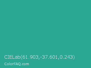 CIELab 61.903,-37.601,0.243 Color is a normal cyan color and the nearest color is Jungle Green #29ab87. Hex code #2ba794 and RGB value is rgb(43,167,148). In RGB color space, this color is composed of 17% red, 65% green, 58% blue, In CMYK color space, this color is composed of 74% cyan, 0% magenta, 11% yellow , 35% black , In HSL color space, this color has a hue angle of 171° , 59% saturation and 41% lightness.