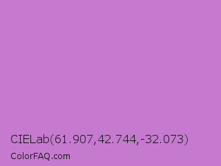 CIELab 61.907,42.744,-32.073 Color is a light magenta color and the nearest color is French Mauve #d473d4. Hex code #c57acf and RGB value is rgb(197,122,207). In RGB color space, this color is composed of 77% red, 48% green, 81% blue, In CMYK color space, this color is composed of 5% cyan, 41% magenta, 0% yellow , 19% black , In HSL color space, this color has a hue angle of 293° , 47% saturation and 65% lightness.