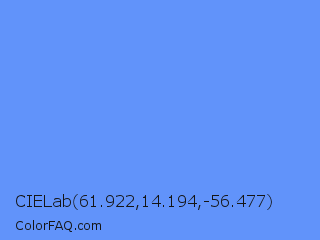 CIELab 61.922,14.194,-56.477 Color is a light blue color and the nearest color is Cornflower Blue #6495ed. Hex code #6193fa and RGB value is rgb(97,147,250). In RGB color space, this color is composed of 38% red, 58% green, 98% blue, In CMYK color space, this color is composed of 61% cyan, 41% magenta, 0% yellow , 2% black , In HSL color space, this color has a hue angle of 220° , 94% saturation and 68% lightness.