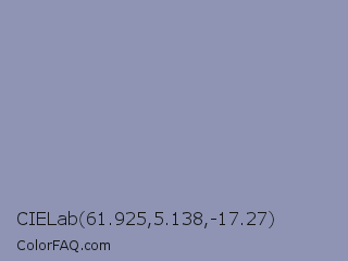 CIELab 61.925,5.138,-17.27 Color is a light blue color and the nearest color is Cool Grey #8c92ac. Hex code #8f94b4 and RGB value is rgb(143,148,180). In RGB color space, this color is composed of 56% red, 58% green, 71% blue, In CMYK color space, this color is composed of 21% cyan, 18% magenta, 0% yellow , 29% black , In HSL color space, this color has a hue angle of 232° , 20% saturation and 63% lightness.