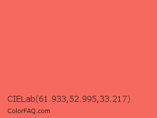 CIELab 61.933,52.995,33.217 Color is a light red color and the nearest color is Pastel Red #ff6961. Hex code #f5695e and RGB value is rgb(245,105,94). In RGB color space, this color is composed of 96% red, 41% green, 37% blue, In CMYK color space, this color is composed of 0% cyan, 57% magenta, 62% yellow , 4% black , In HSL color space, this color has a hue angle of 4° , 88% saturation and 66% lightness.