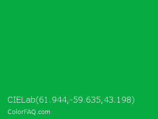 CIELab 61.944,-59.635,43.198 Color is a normal green color and the nearest color is Green Pantone #00ad43. Hex code #07ad43 and RGB value is rgb(7,173,67). In RGB color space, this color is composed of 3% red, 68% green, 26% blue, In CMYK color space, this color is composed of 96% cyan, 0% magenta, 61% yellow , 32% black , In HSL color space, this color has a hue angle of 142° , 92% saturation and 35% lightness.
