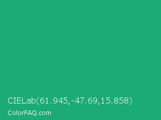 CIELab 61.945,-47.69,15.858 Color is a normal green color and the nearest color is Green Crayola #1cac78. Hex code #1baa78 and RGB value is rgb(27,170,120). In RGB color space, this color is composed of 11% red, 67% green, 47% blue, In CMYK color space, this color is composed of 84% cyan, 0% magenta, 29% yellow , 33% black , In HSL color space, this color has a hue angle of 159° , 73% saturation and 39% lightness.