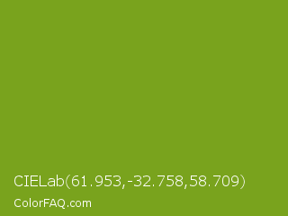 CIELab 61.953,-32.758,58.709 Color is a normal lime color and the nearest color is Christi #67a712. Hex code #79a31d and RGB value is rgb(121,163,29). In RGB color space, this color is composed of 47% red, 64% green, 11% blue, In CMYK color space, this color is composed of 26% cyan, 0% magenta, 82% yellow , 36% black , In HSL color space, this color has a hue angle of 79° , 70% saturation and 38% lightness.