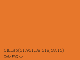 CIELab 61.961,38.618,58.15 Color is a normal orange color and the nearest color is Vivid Tangelo #f07427. Hex code #e7772b and RGB value is rgb(231,119,43). In RGB color space, this color is composed of 91% red, 47% green, 17% blue, In CMYK color space, this color is composed of 0% cyan, 48% magenta, 81% yellow , 9% black , In HSL color space, this color has a hue angle of 24° , 80% saturation and 54% lightness.