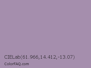 CIELab 61.966,14.412,-13.07 Color is a light purple color and the nearest color is Glossy Grape #ab92b3. Hex code #a58ead and RGB value is rgb(165,142,173). In RGB color space, this color is composed of 65% red, 56% green, 68% blue, In CMYK color space, this color is composed of 5% cyan, 18% magenta, 0% yellow , 32% black , In HSL color space, this color has a hue angle of 285° , 16% saturation and 62% lightness.