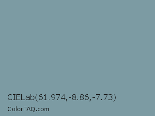 CIELab 61.974,-8.86,-7.73 Color is a normal cyan color and the nearest color is Gumbo #7ca1a6. Hex code #7c9ba3 and RGB value is rgb(124,155,163). In RGB color space, this color is composed of 49% red, 61% green, 64% blue, In CMYK color space, this color is composed of 24% cyan, 5% magenta, 0% yellow , 36% black , In HSL color space, this color has a hue angle of 192° , 17% saturation and 56% lightness.